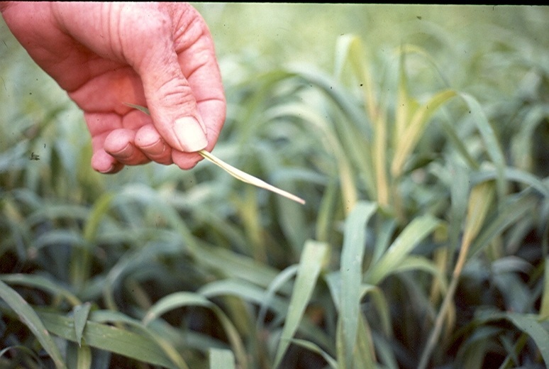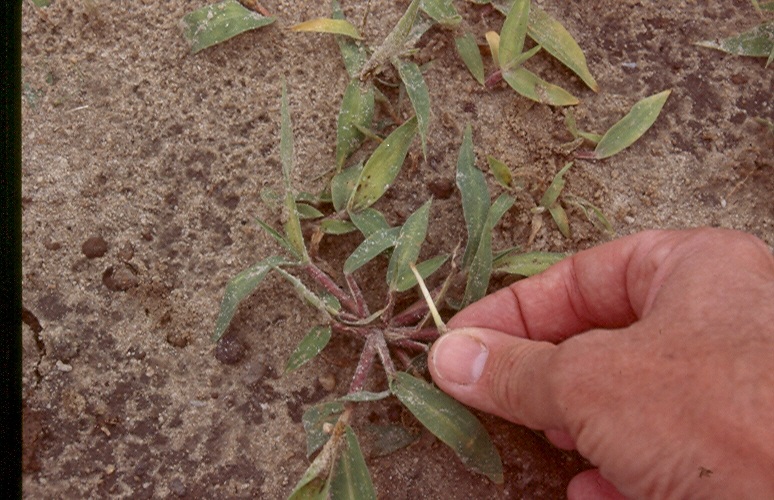 - About three weeks after spraying, pull an unfolded leaf bud from a treated grass plant.